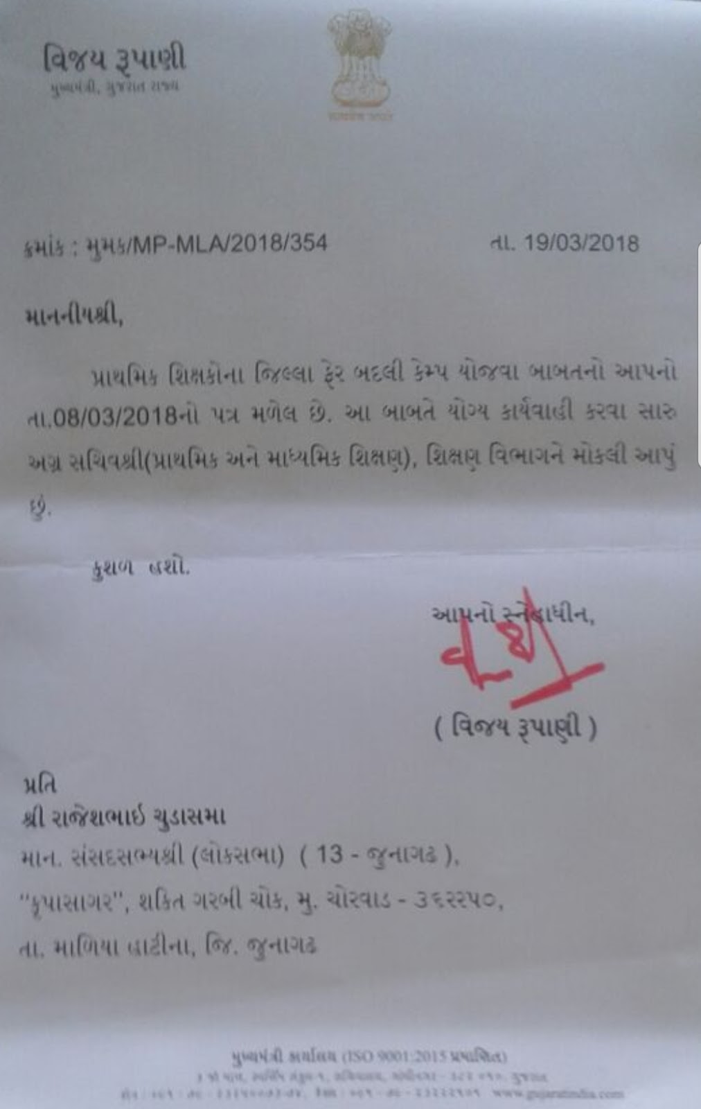 PRATHMIK SHIXAKO NA JILLAFER BADALI CAMP BABAT GUJARAT RAJYA NA MUKHYA MANTRI NO LETTER DATE-19-3-2018.